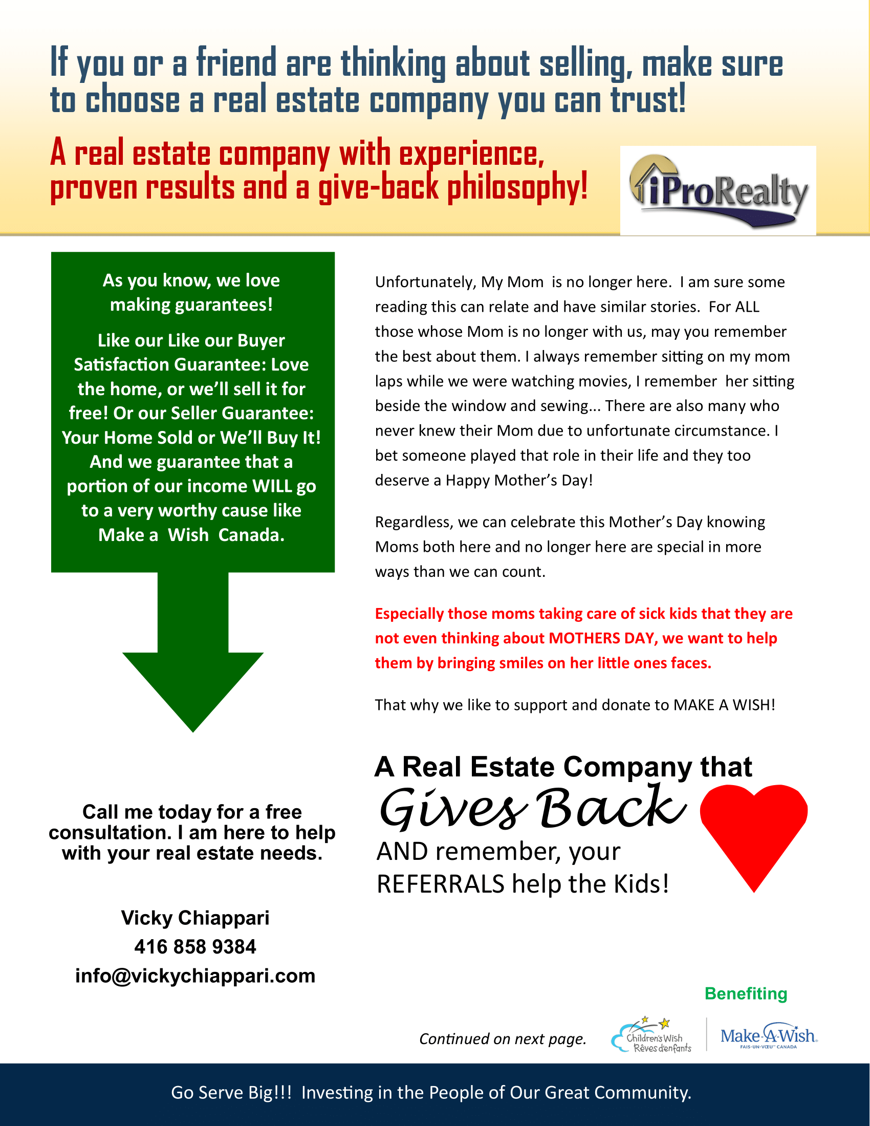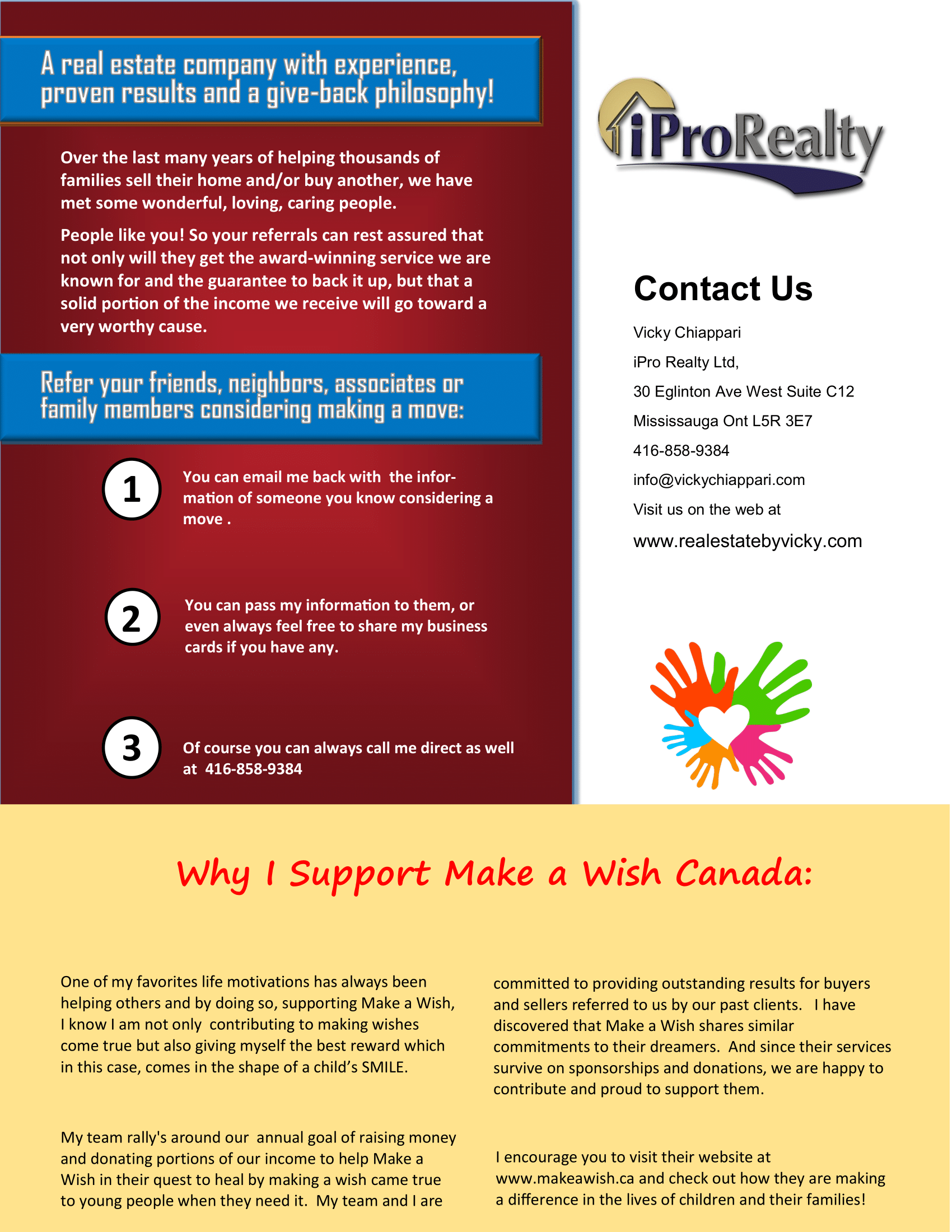 We are on a mission to raise money to Make A Wish Canada, I do this by donating a portion of my income from the homes we sell. Make A Wish is the largest wish-granting organization in the world, making dreams and wishes come true for children with life-threatening illnesses since 1980 The Mission of Make a Wish is to provide children with life-threatening illnesses the opportunity to realize their most heartfelt wish, giving them the strength to endure their treatments and build resilience. When children are battling a critical illness, so much of normal childhood is taken away from them — it is exhausting, both emotionally and physically. A wish is something that gives children the opportunity to look outside their illness — it restores a sense of childhood back to the child and normalcy back to the family. Most don’t know though that Make a Wish is a non-profit. It Truly does take a Village to grant this wishes. Individuals donors, corporations, foundations, community groups and thousands of volunteers make this possible through their generosity and dedication. |