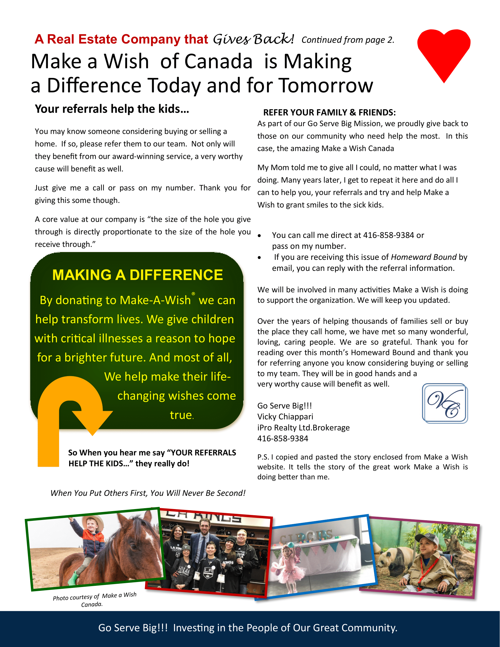 If you are receiving Homeward Bound for the first time, you will notice we give back to those in our who need help the most. Like Make a Wish Canada.